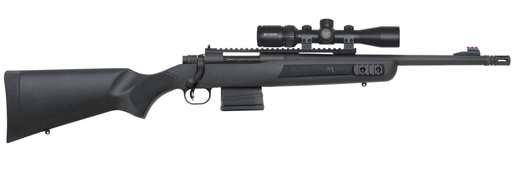 Mossberg’s MVP Scout features a Dual-Push bolt design that accepts and feeds both M1A and AR10 style magazines. The 16.25″ medium bull barrel is threaded with removable A2-style flash suppressor (thread cap provided), and the front fiber optic sight is paired with a rail-mounted ghost ring rear sight. It has a standard Mossberg LBA Adjustable trigger, oversized tactical bolt handle, pillar-bedded stock, and 11″ Picatinny rail with two side-mounted rails. This scoped combo includes a Vortex Crossfire II Scout Scope and sling.